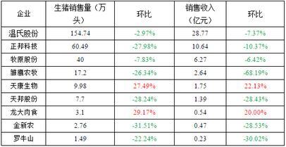截至五月底,温氏、正邦科技、牧原、雏鹰、天康、天邦股份、龙大肉食、金新农、罗牛山等9家企业已陆续公布4月份生猪销售简报。其中温氏4月销售生猪154.74万头、正邦科技4月销售生猪60.49万头、牧原4月份销售生猪超40万头,雏鹰4月销售生猪17.2万头。其中,天康生物和龙大肉食销量与收入环比均上涨,其他企业环比均下降,各个公司销量与收入具体见下表: