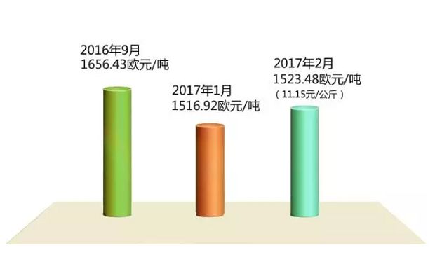 欧盟猪肉价格2016年4月份开始连续6个月上涨至9月份1656.43欧元/吨,随后震荡回落至2017年1月份1516.92欧元/吨,2月份为1523.48欧元/吨,环比涨0.4%,同比涨19.3%。按同期人民币汇率折算,2月份欧盟猪肉价格为11.15元/公斤。