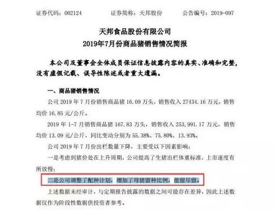 天邦股份打响第一枪~ 在7月的销售简报里提到,考虑到猪价处于上升周期,公司提高了生猪出栏体重标准,上市速度有所放慢。另外公司调整了配种计划,增加了母猪留种比例,能留尽留。