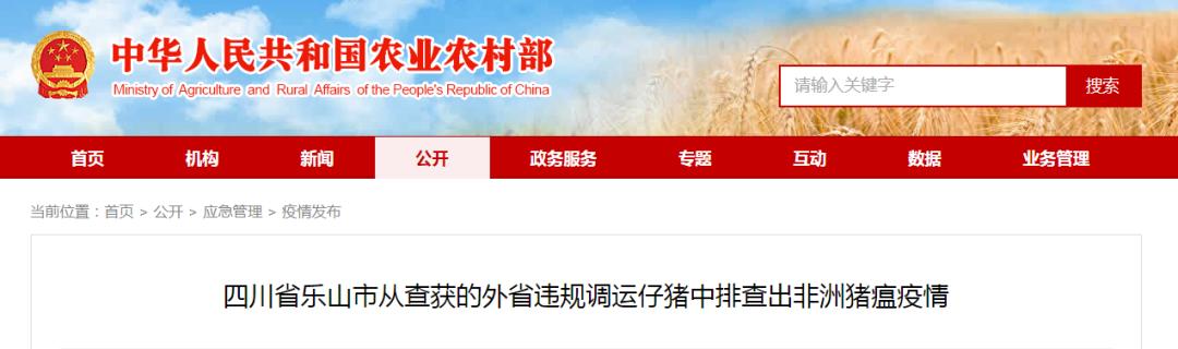 农业农村部新闻办公室4月1日发布,农业农村部接到中国动物疫病预防控制中心报告,经四川省动物疫病预防控制中心确诊,在乐山市界内的乐自高速大佛停车区查获一辆来自外省的仔猪运输车中排查出非洲猪瘟疫情。查获时,该车辆共载有仔猪83头,死亡1头。