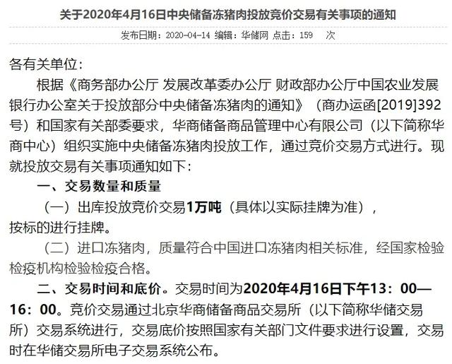 4月14日,华储网发布《关于2020年4月16日中央储备冻猪肉投放竞价交易有关事项的通知》称,4月16日将出库投放竞价交易1万吨中央储备冻猪肉。