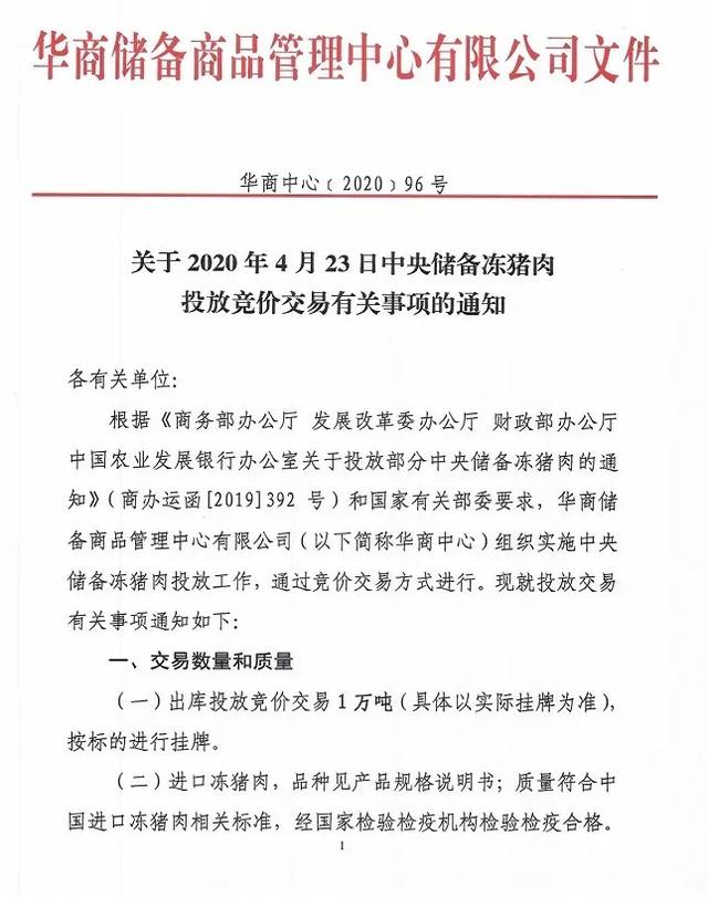 4月21日,华储网发布《关于2020年4月23日中央储备冻猪肉投放竞价交易有关事项的通知》称,4月23日将出库投放竞价交易1万吨中央储备冻猪肉。