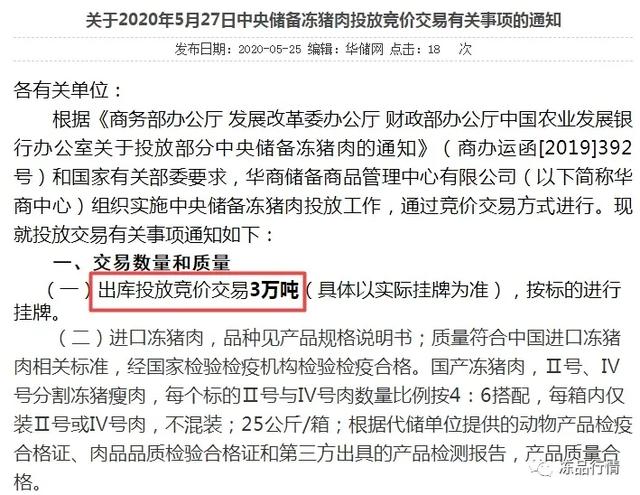华储网发布《关于2020年5月27日中央储备冻猪肉投放竞价交易有关事项的通知》称,5月27日将出库投放竞价交易3万吨中央储备冻猪肉。