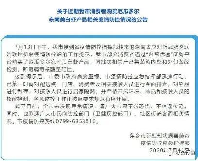 据萍乡发布:7月13日下午,江西萍乡部分消费者通过“兴盛优选”团购平台购买了厄瓜多尔冻南美白虾产品,同批次相关产品集装箱内壁和外包装经检测,新冠病毒核酸呈阳性。