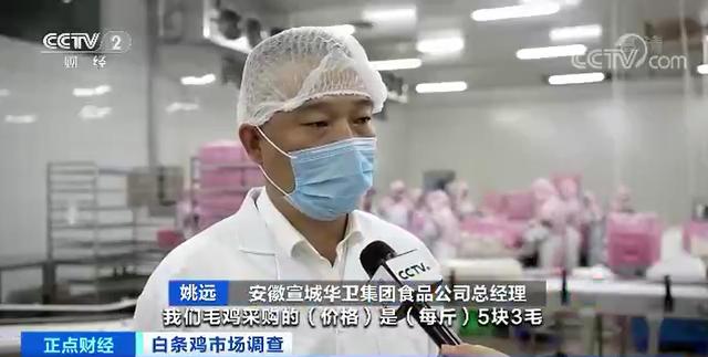 安徽宣城华卫集团食品公司总经理 姚远:毛鸡采购价格每斤5.3元,销出去产品最低价格一斤2.5元左右,所以3斤多重的一只鸡就要亏10元左右。
