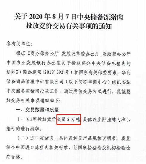 华储网8月4日发布中央储备冻猪肉投放竞价交易有关事项的通知,将竞价交易2万吨,交易时间为2020年8月7日下午13时至16时,这是今年以来第27批投放的中央储备冻猪肉,累计投放量将达49万吨。
