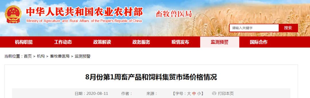 农业农村部畜牧兽医局对全国500个县集贸市场的定点监测,8月份第1周(采集日为8月5日)生猪产品、主产省鸡蛋、活鸡、白条鸡、商品代蛋雏鸡、牛羊肉、生鲜乳、饲料价格上涨,商品代肉雏鸡价格下降。