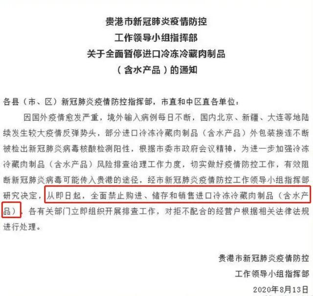 全面暂停进口冷冻冷藏肉制品(含水产品)通知: