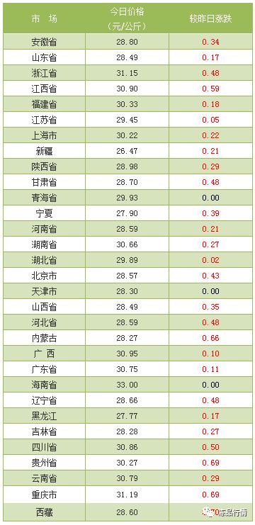 内三元均价28.96元/公斤,相比昨日上涨0.17元/公斤。