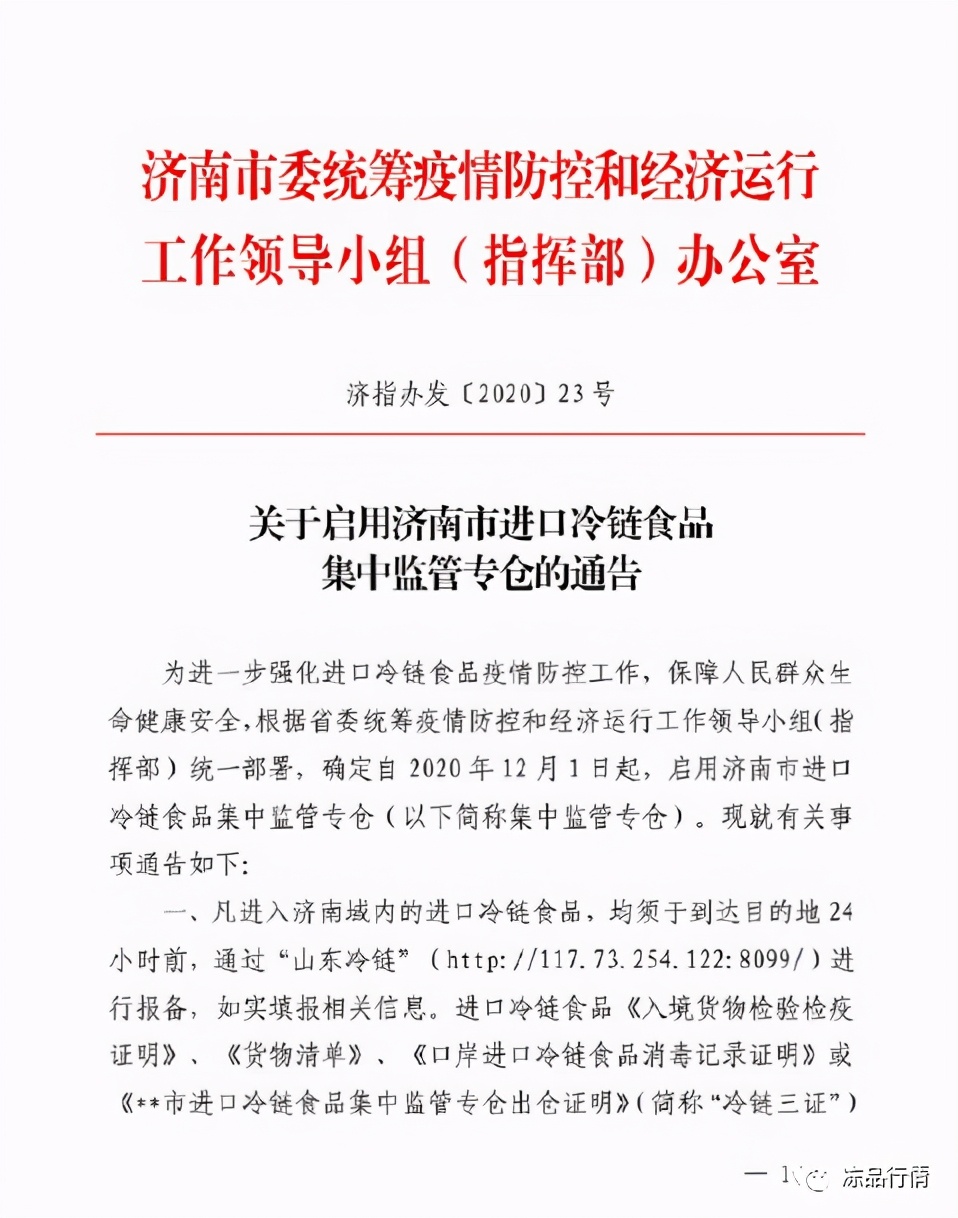 12月1日,济南市正式发布《关于启用济南市进口冷链食品集中监管专仓的通告》(以下简称《通告》)。《通告》指出,根据省委统筹疫情防控和经济运行工作领导小组(指挥部)统一部署,确定自2020年12月1日起,启用济南市进口冷链食品集中监管专仓(以下简称集中监管专仓)。