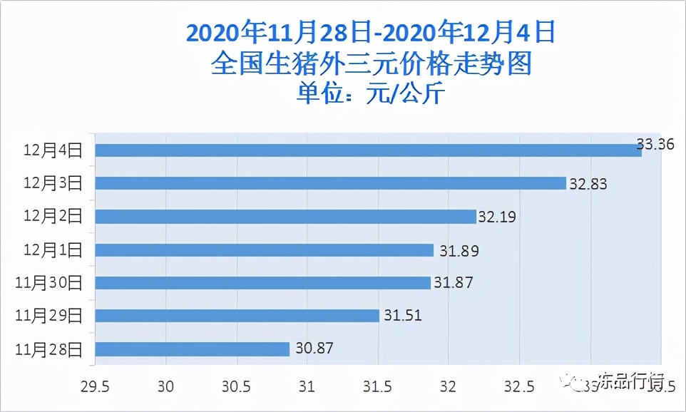 12月4日,根据养猪网数据统计全国生猪(外三元)均价33.36元/公斤,相比昨日上涨0.53元/公斤;