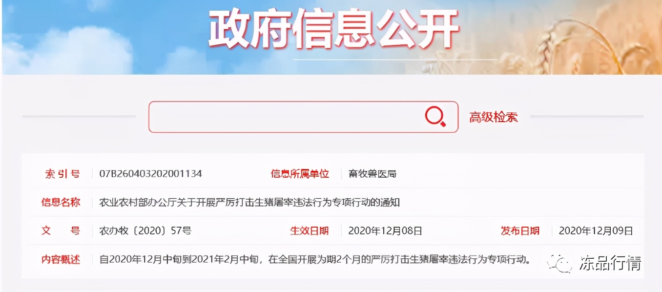 《通知》指出,随着冬季,特别是元旦春节消费旺季的到来,猪肉产品消费将进入高峰期,从近期各地案件查办情况看,私屠滥宰等屠宰环节违法案件呈上升趋势。为切实维护生猪屠宰行业秩序,保证生猪产品质量安全,保障节日期间猪肉消费安全和人民身体健康,农业农村部决定自2020年12月中旬到2021年2月中旬,在全国开展为期2个月的严厉打击生猪屠宰违法行为专项行动。