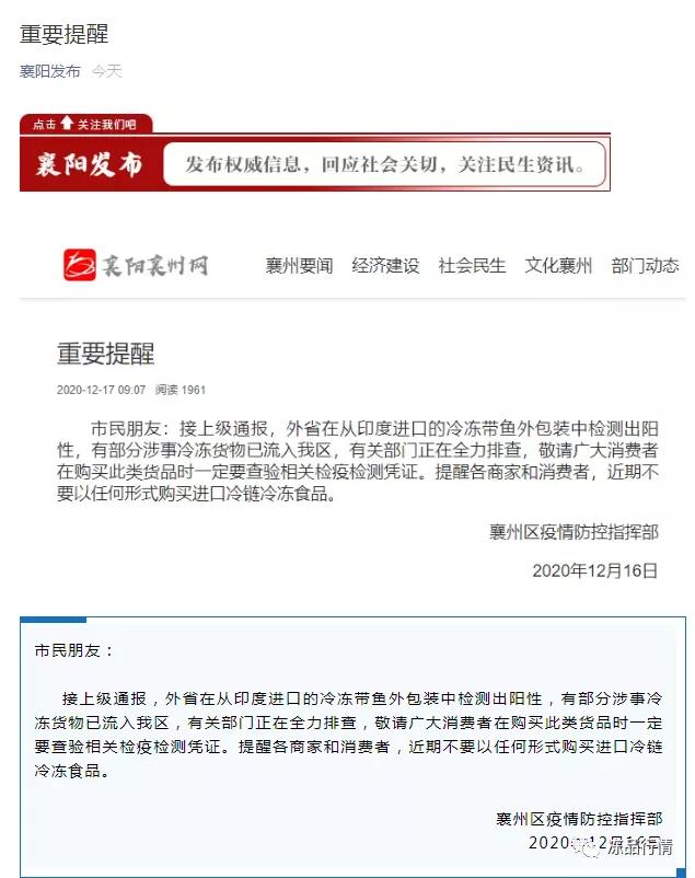 据襄阳发布12月17日消息,据襄州区疫情防控指挥部:接上级通报,外省在从印度进口的冷冻带鱼外包装中检测出阳性,有部分涉事冷冻货物已流入我区,有关部门正在全力排查,敬请广大消费者在购买此类货品时一定要查验相关检疫检测凭证。提醒各商家和消费者,近期不要以任何形式购买进口冷链冷冻食品。