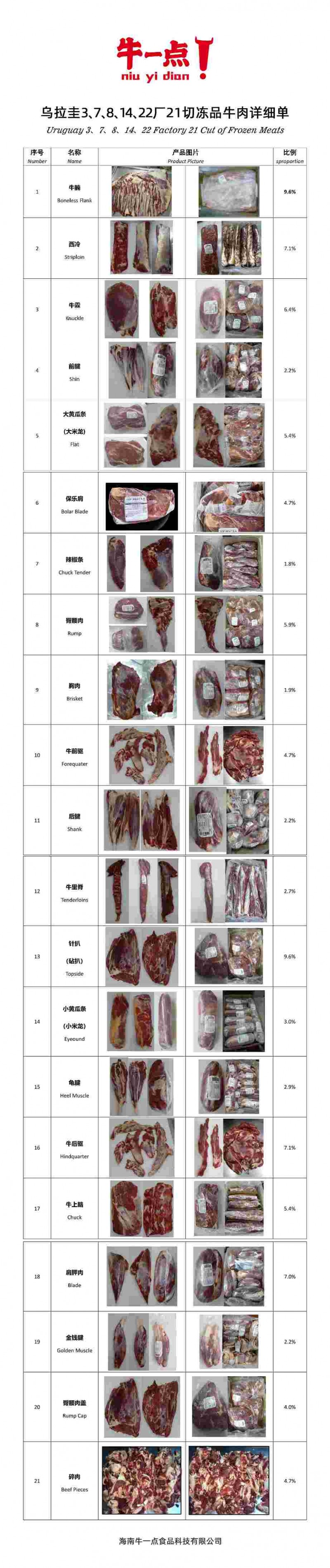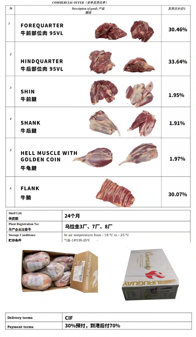 乌拉圭去骨6切,21切产品(同央企签约): 厂号:乌拉圭3、7、8、14、22厂 产品:去骨6切,21切 每柜重量:约26-27吨 cif美金价:期货价6400美金;半期货6600美金 到港清关完税单价:期货价人民币 49000元/吨;半期货价人民币51500元/吨(价格是到中国主要沿海港口,清关消杀后的完税价,含关税增值税发票,五证一码) 大致装箱日期: 2022年5月上旬 付款方式:支持国内可转让信用证和30%预付模式 联系电话同微信