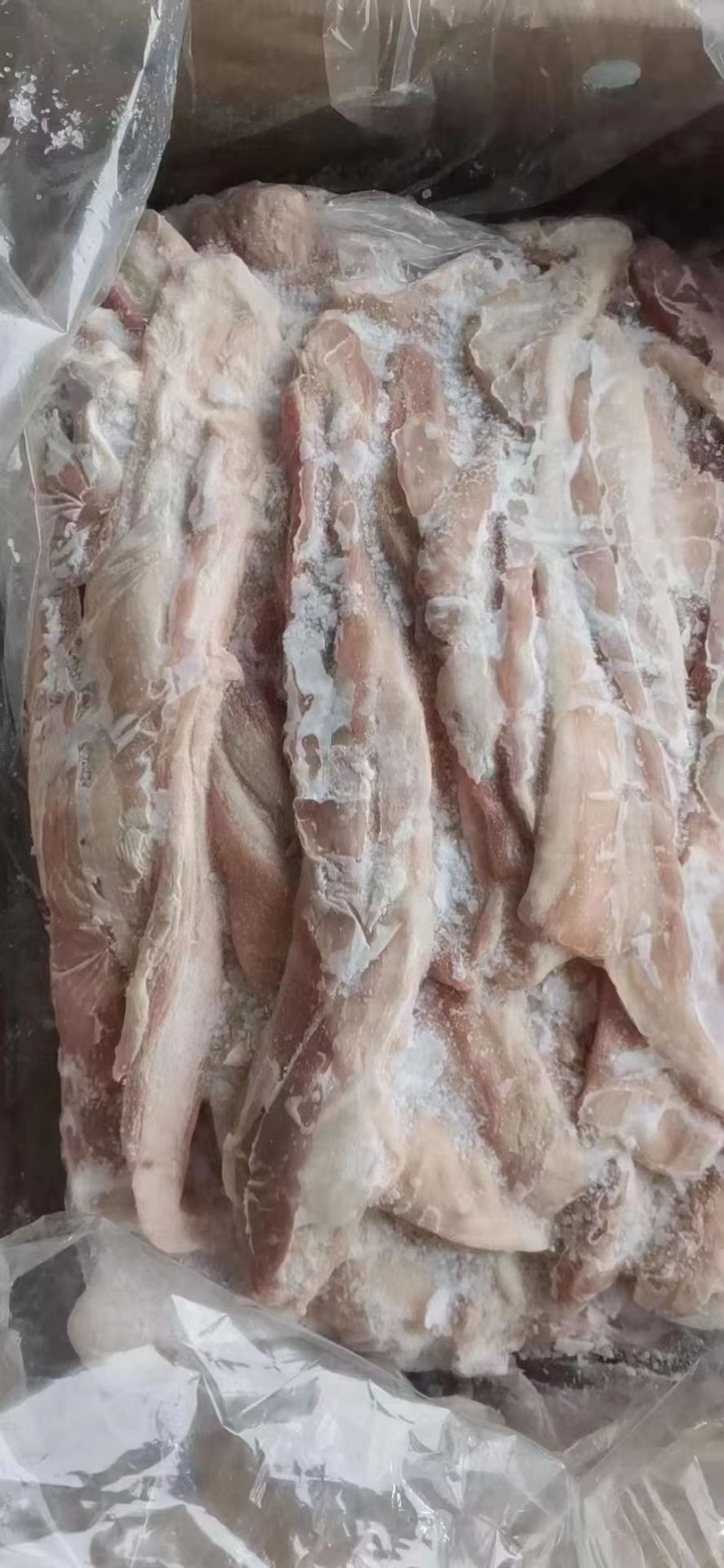 去皮五花肉条,安徽提货, 原始检疫,22年3/4月份生产 10吨。无变色,无变味,无中间隔膜。 通出,11000元