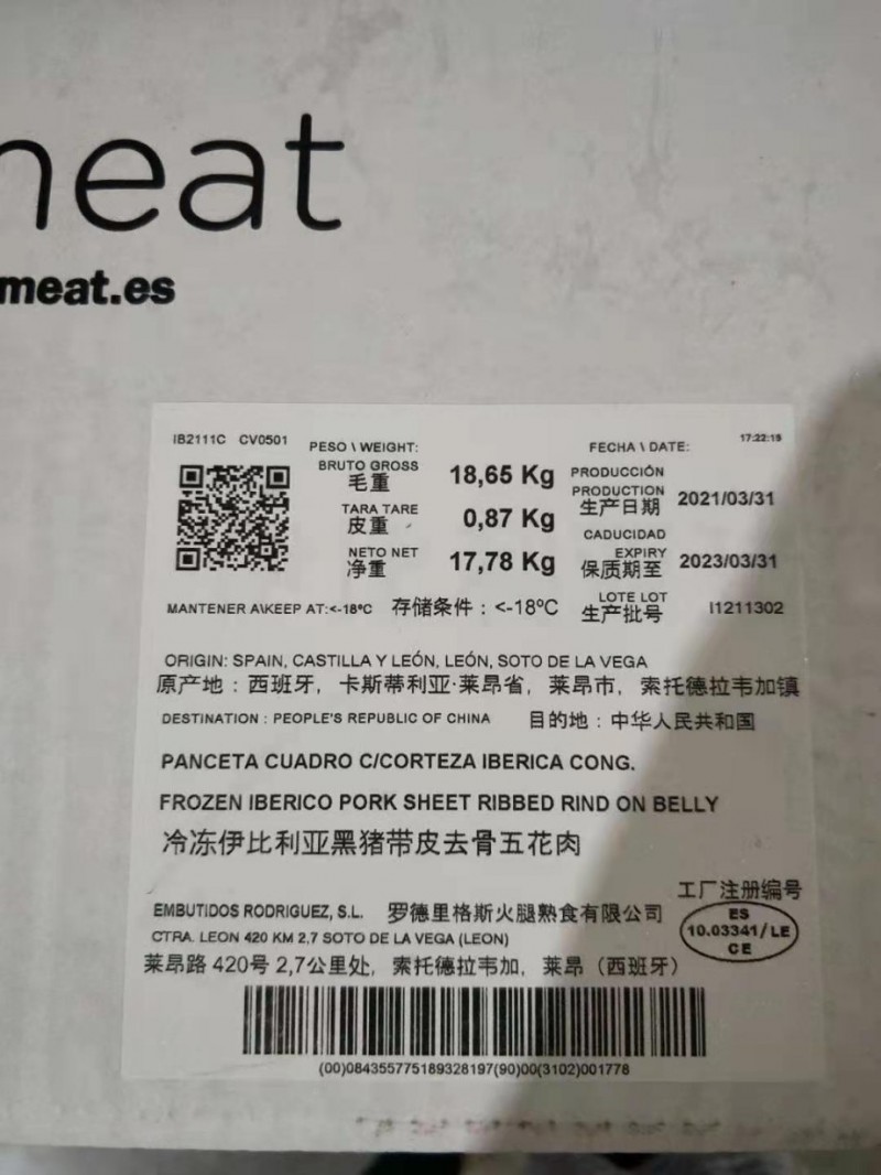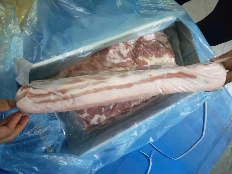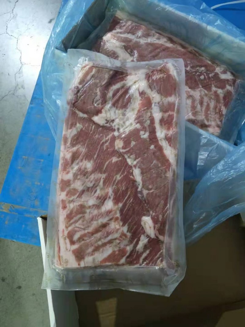 河北提货四证齐全,21年3月份生产日期!黑猪带皮五花肉一柜