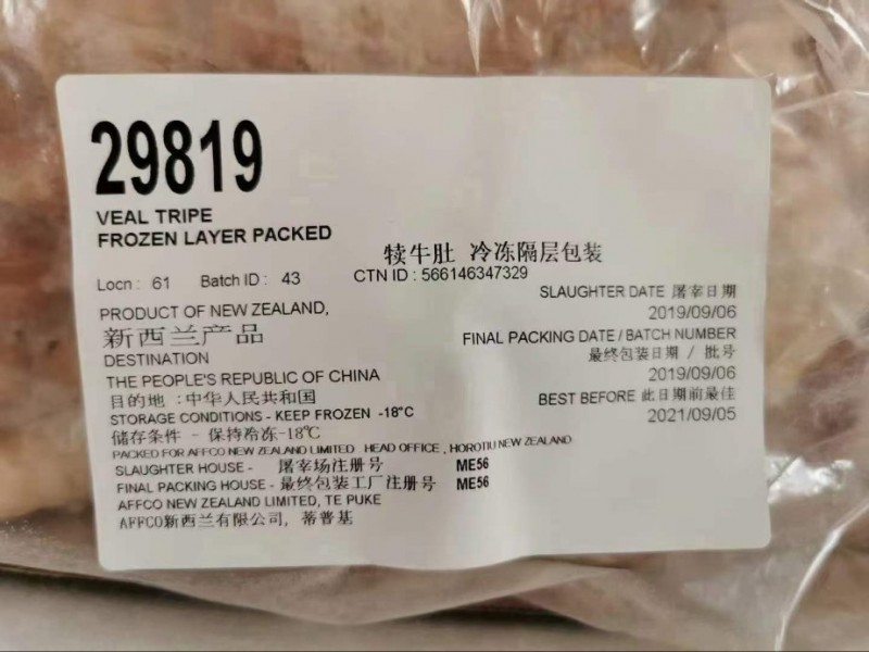 新西兰小牛牛肚: ① 犊牛肚:新西兰39/47/56/135厂 天津中渔,咨询优惠!