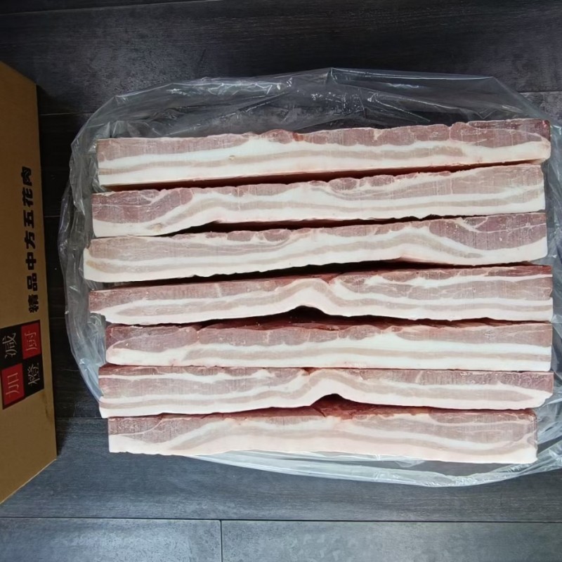自有屠宰场鲜品分割,挑拣厚度4cm左右的五花肉原料,经整形速冻厚精修。避免二次解冻。产品块型规整,薄厚均匀,颜色鲜亮。每箱约6-7块