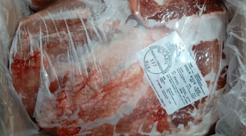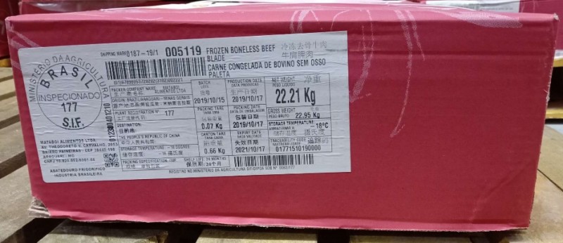 冷冻去骨牛肩胛肉 报关单号:224820191000169079 检疫号:119000008999064001 箱重:约25KG 产地:巴西 单块重量:约11.22KG