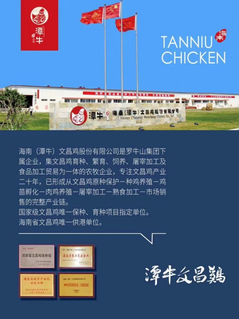 海南(潭牛)文昌鸡股份有限公司是罗牛山集团下属企业,集文昌鸡育种、繁育、饲养、屠宰加工及食品加工贸易为一体的农牧企业,专注文昌鸡产业二十年,已形成从文昌鸡原种保护一种鸡养殖﹣鸡苗孵化一肉鸡养殖﹣屠宰加工﹣熟食加工﹣市场销售的完整产业链。 国家级文昌鸡唯一保种、育种项目指定单位。海南省文昌鸡唯一供港单位。