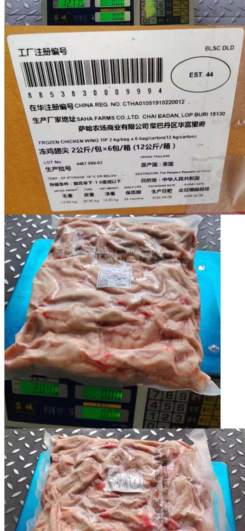 我司进口的冷冻产品有冷冻凤爪、冷冻鸡中翅、冷冻鸡肌腱等各类鸡附件产品。原产地为泰国,工厂名称:Saha Farms Co.,Ltd. 工厂注册号:885888808500,在华注册编号:CTHA01051808010002,产品工厂号:EST44和EST129,包装规格:12公斤/箱,是泰国冻品最大的出口商,占泰国出口的22.68%份额,是国内鸡产品的顶级品牌,整个中国区只有五家进口商,我们是其中一家,我们公司用了二年时间,通过泰国正大集团高层的沟通才拿到这进口商资格,以前中国区是4家的,现向他们进口的产品是:各种大小规格的凤爪,鸡中翅,鸡脚筋,鸡脚尖等产品,慢慢的会扩大产品品种。目前进口港口在:盐田港,青岛港,上海港,宁波港,价格随行就市,(我们是直接进口商),谢谢![抱拳]