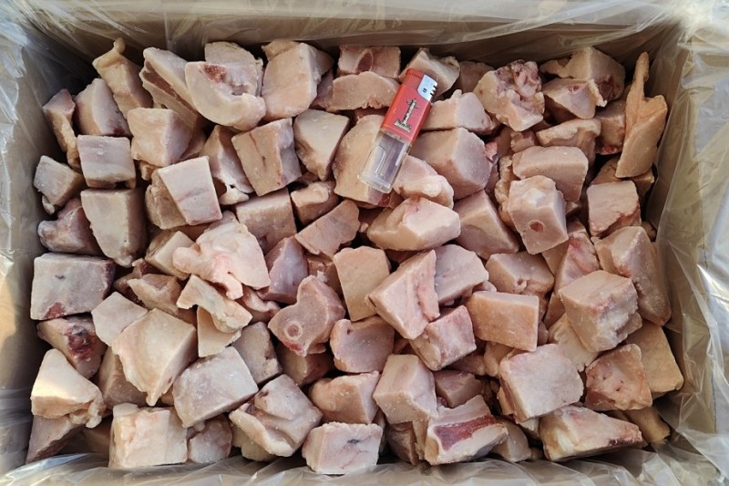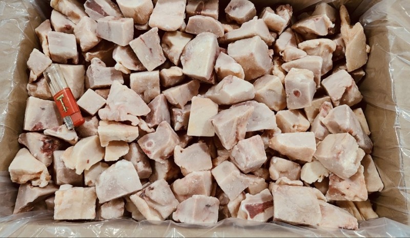 采用东北带骨上腿肉为原料,原切鸡腿块,含水≤10%,不添加色素,偶有切割过程中产生的碎骨和碎肉,比例不超过3%。