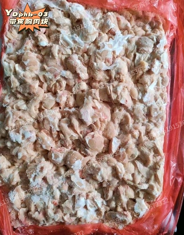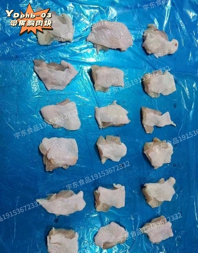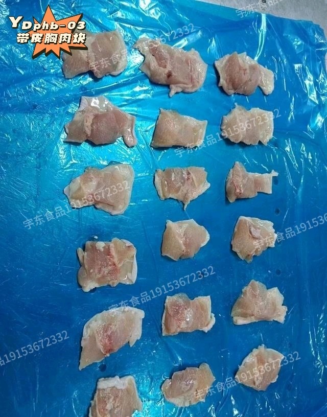 货品:带皮胸肉块 规格:10*2 备注:带皮胸肉块,皮肉相符,水点低。大小块均匀。