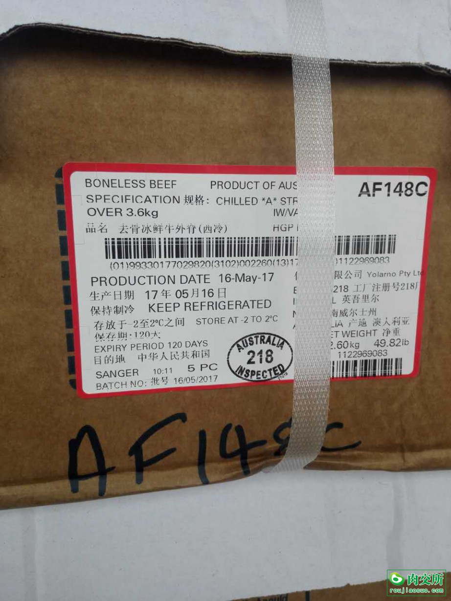 澳洲218厂进口正关冰鲜西冷,A级草饲,好箱好货,欢迎试样。
