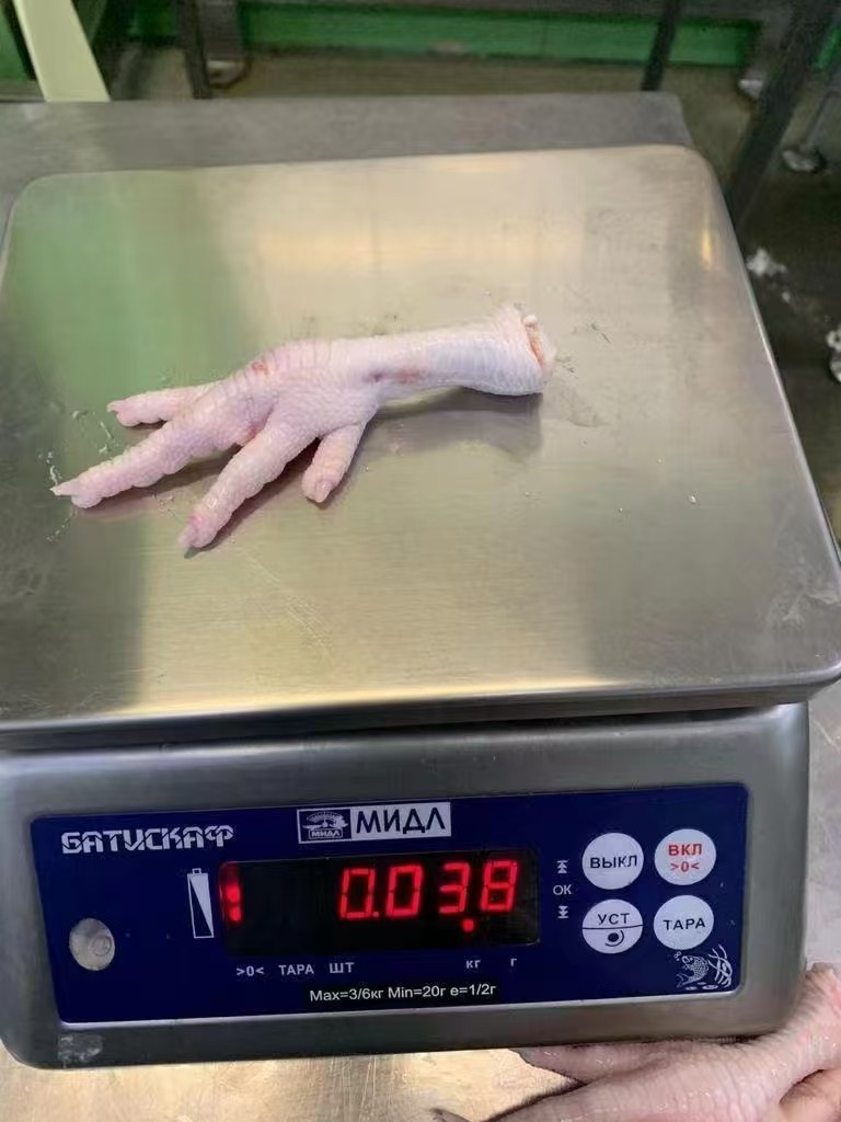 130%4777@2880 4、规格及包装: A级冻鸡脚重量大于35G+ ,长度12—18厘米,每袋5公斤每箱3袋,垫保留,纸箱15-20公斤无损坏。