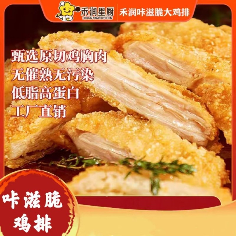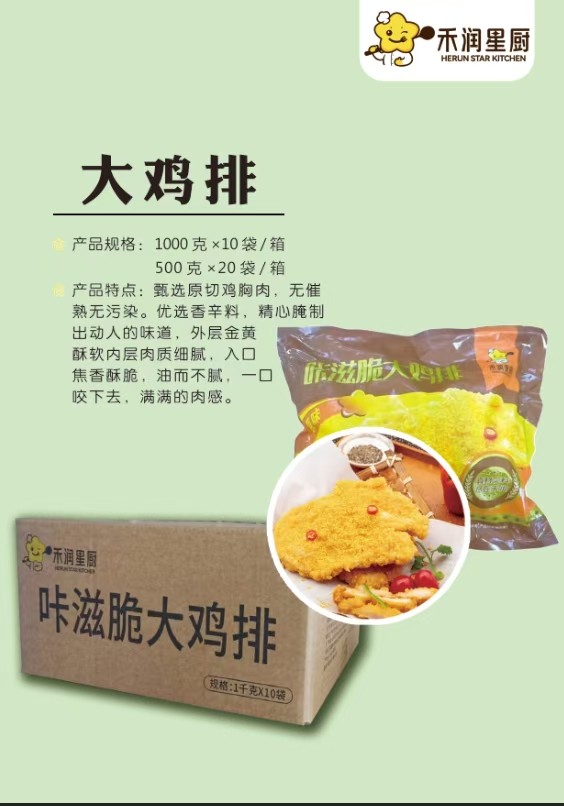 工厂自营,2025年当月新日期。 咔滋脆鸡排,精修原料整肉裹粉,100克每片,500克每包,20包每箱;1000克每包,10包每箱。禾润央厨158-0633-0521王