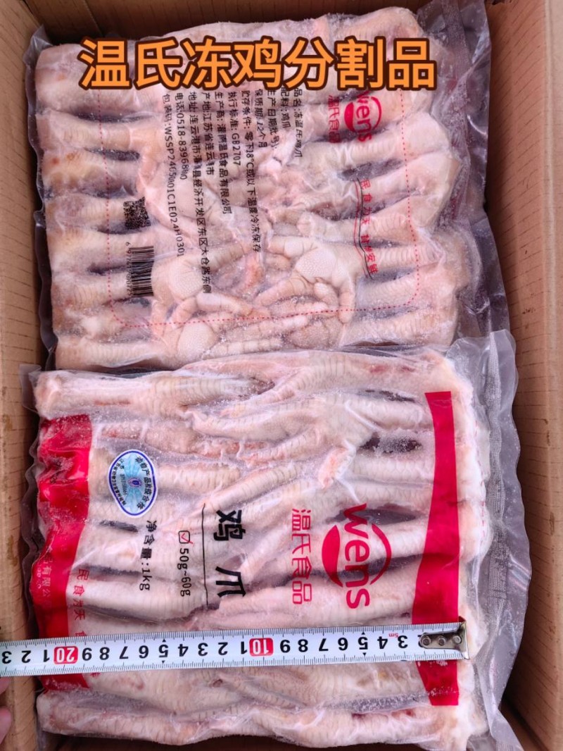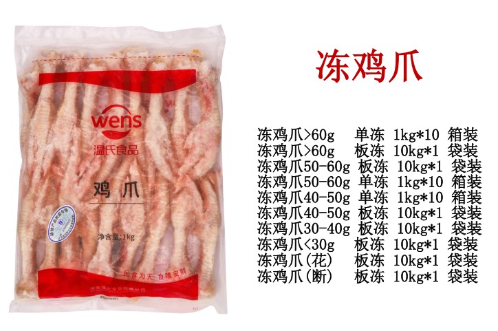 大于60g 30.2/kg(箱装10包) 大于60g 27/kg (袋装1板) 50—60g 24/kg(袋装1板) 50—60g 28.7/kg(箱装10包) 40—50g 26.1/kg(箱装10包) 40—50g 23.4/kg(袋装1板) 30—40g 21.8/kg(袋装1板) 小于30g 27.2/kg(袋装1板) 鸡爪(花) 19.6/kg 鸡爪(断) 21.8/kg