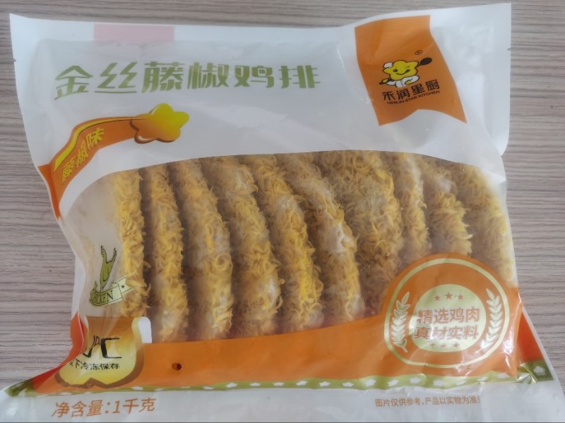 工厂自营,2025年当月新日期。 金丝鸡排,口味:原味、藤椒。100克每片,10片每包,10包每箱。 禾润央厨158-0633-0521王