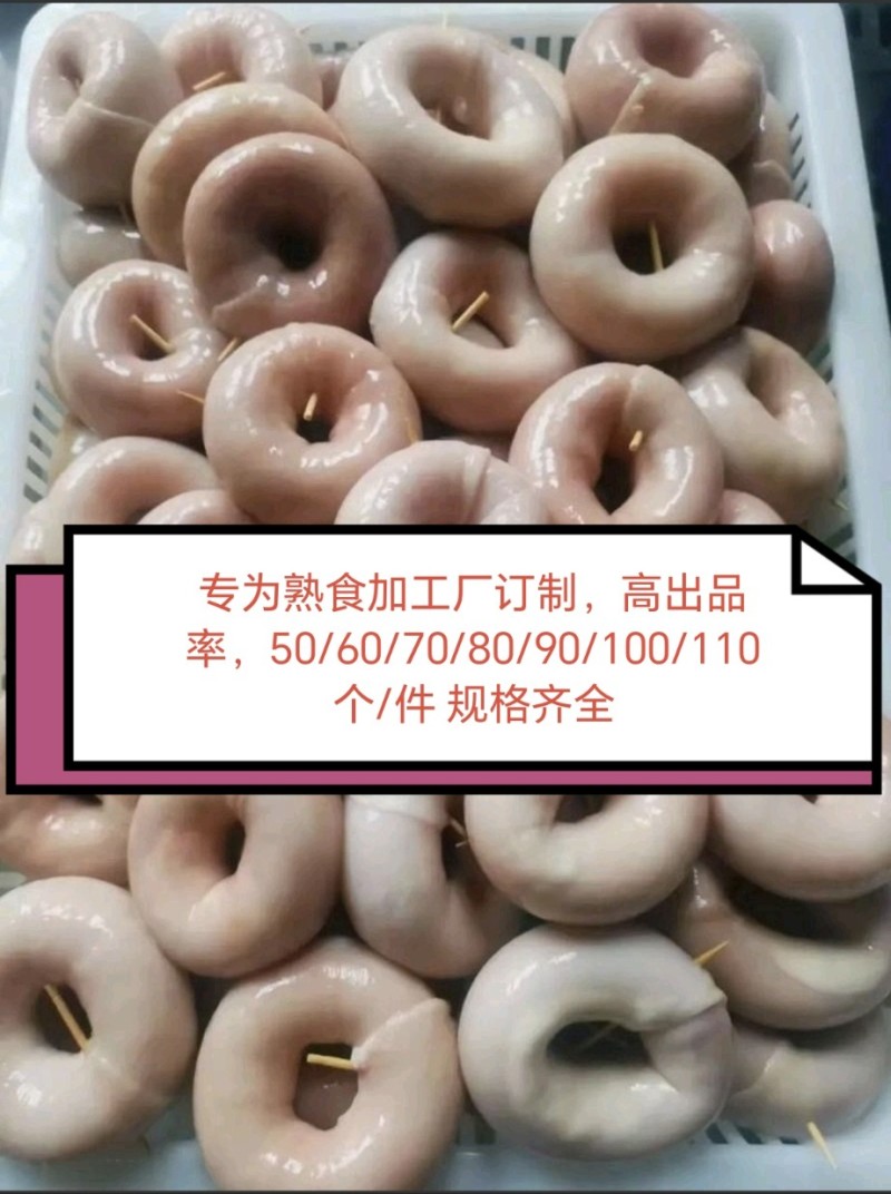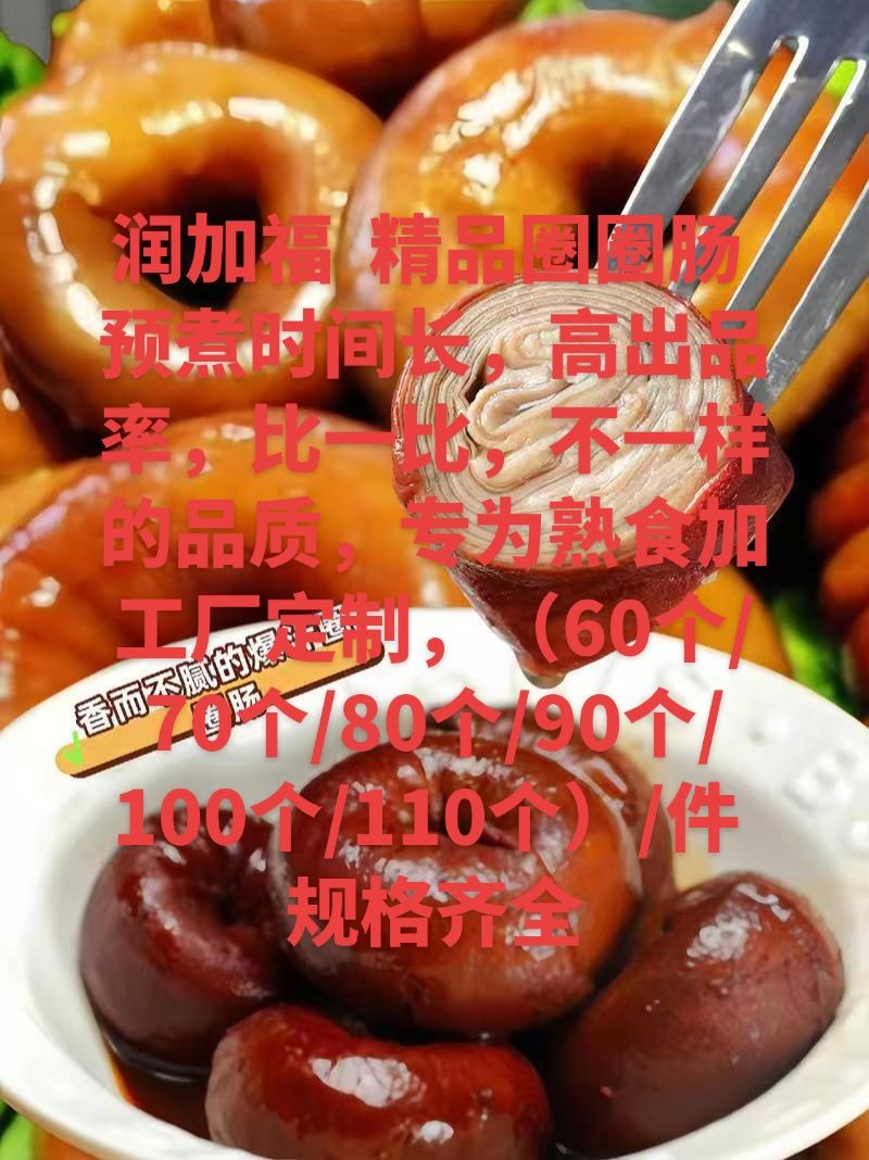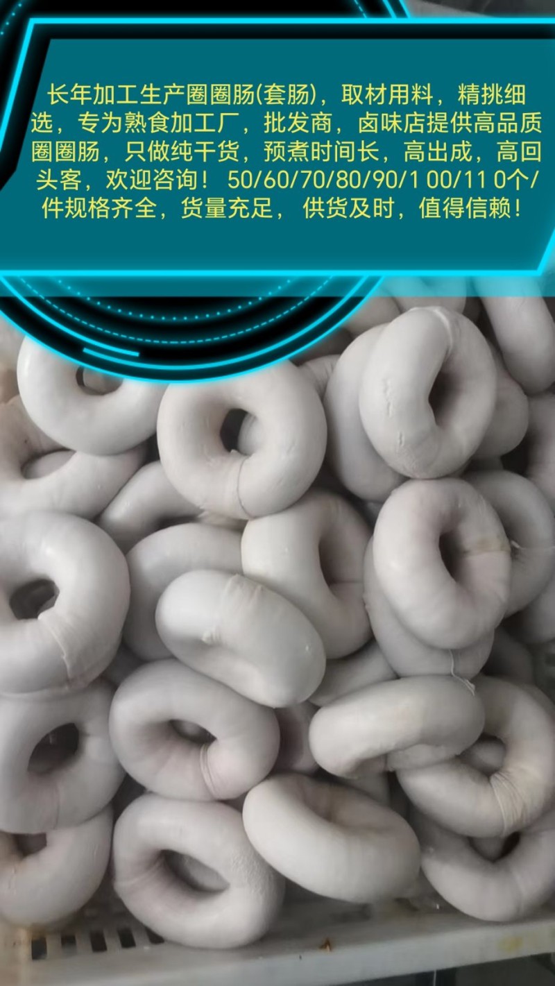 长年加工生产圈圈肠(套肠),取材用料,精挑细选,专为熟食加工厂,批发商,卤味店提供高品质圈圈肠,只做纯干货,预煮时间长,高出成,高回头客,欢迎咨询! 50/60/70/80/90/1 00/11 0个/件规格齐全,货量充足, 供货及时,值得信赖!