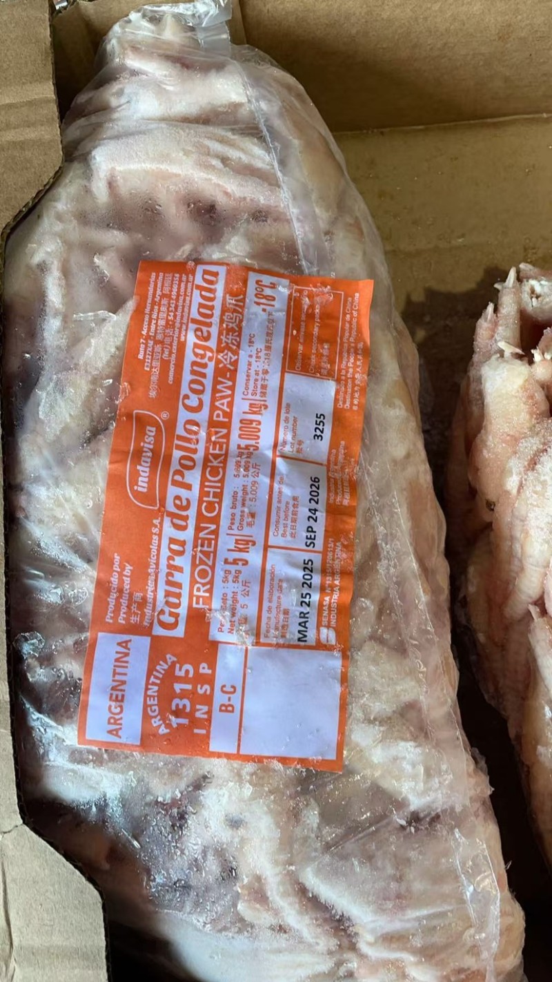 阿根廷1315(标识179C)AB级,33克+,15公斤装,70%凤爪30克以上,30%分爪30克以下,小黑订率10%左右,颜色鲜度好,切口正常,冰水5%左右.深圳现货带票出售