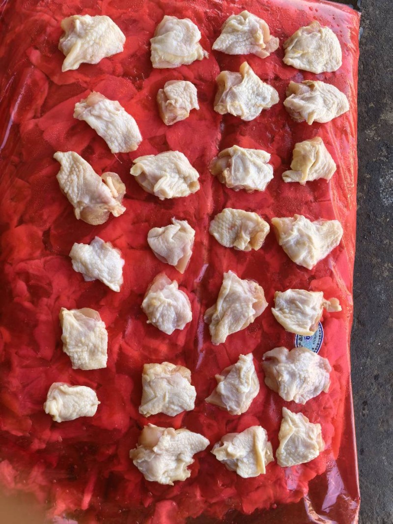 带皮胸肉块,皮肉相符,水分13个左右,可以做辣子鸡,油黄鸡用
