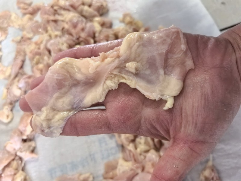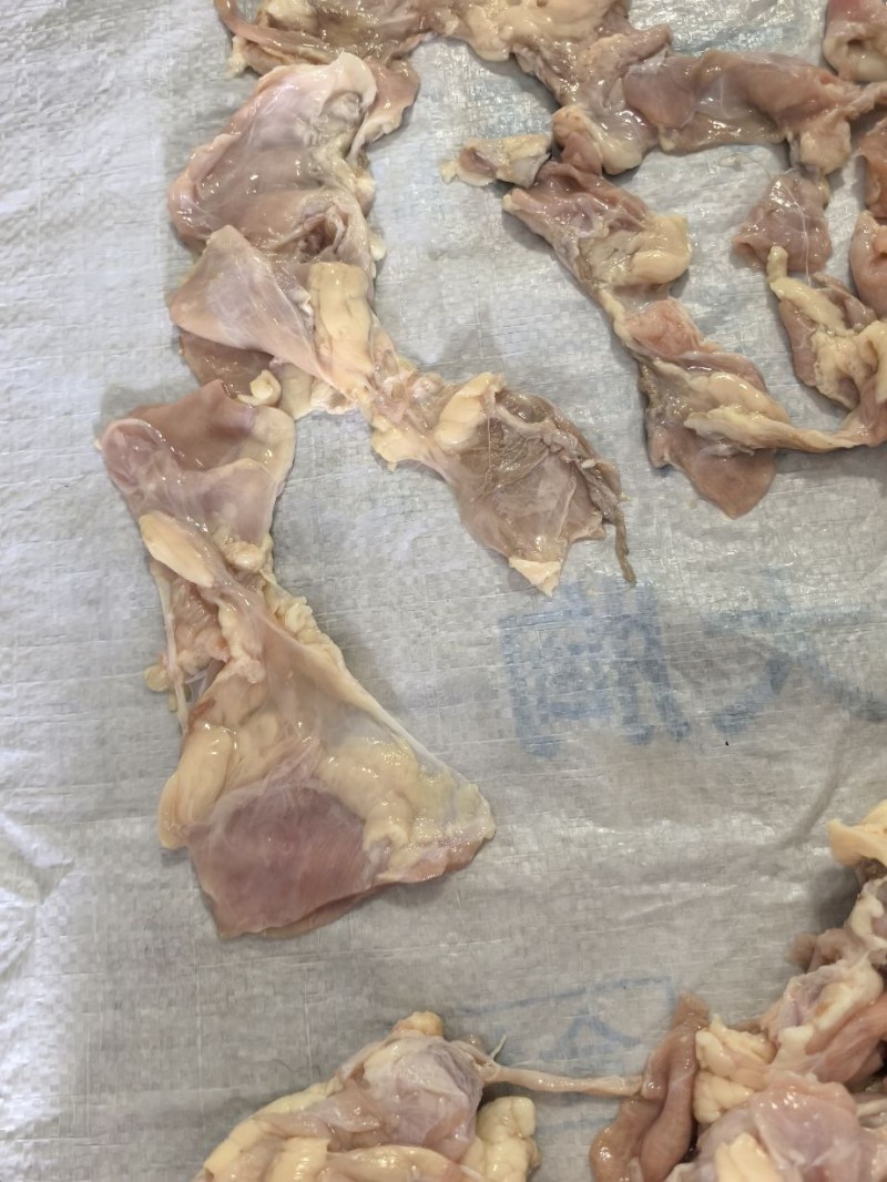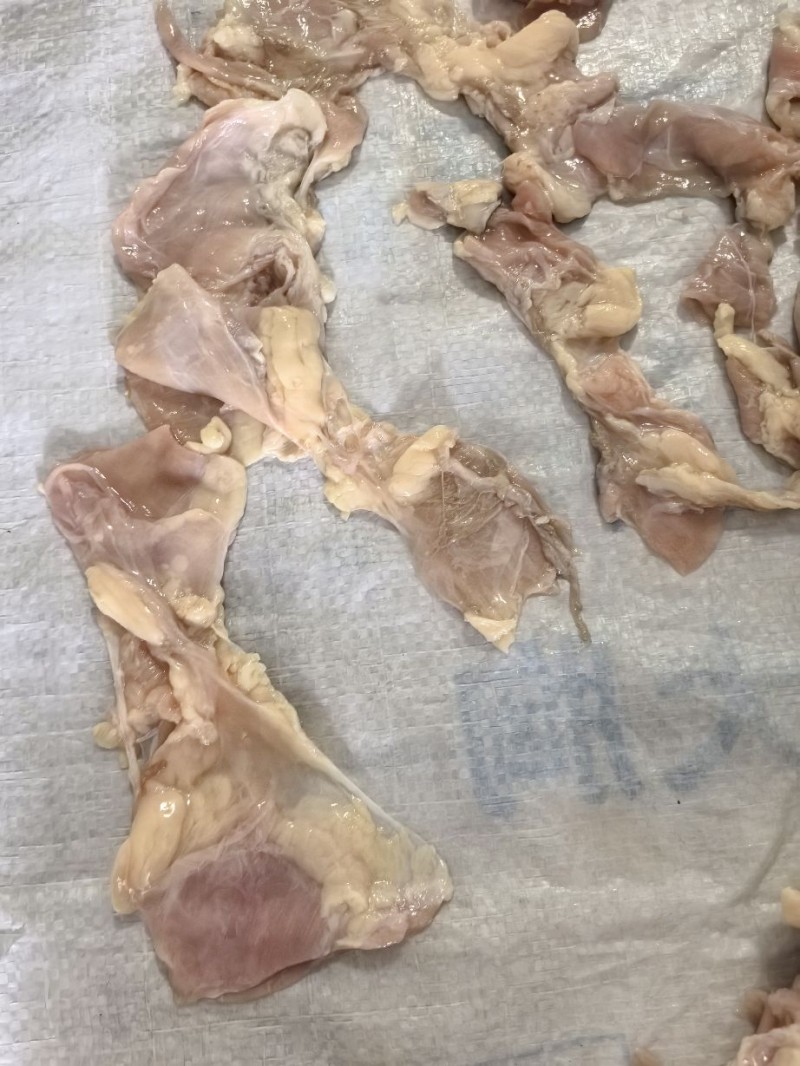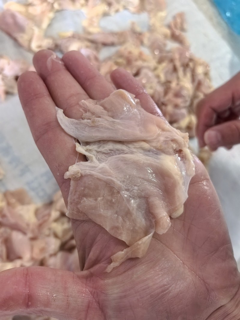 鸡腹膜肉,无骨的。水分不大。屠宰厂一手货源。