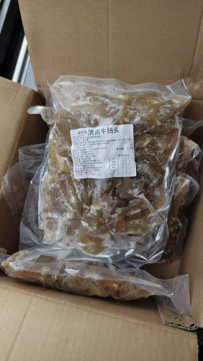 名称:嗦咩咩清卤全熟牛肠头段 规格:1kg*5袋/件 产品特点:全熟纯干无碱发,手工裁切,肠中精品,口感醇厚,胶质丰富,固形物≥99%,开袋即用 解冻后重量:单包解冻净重1.9斤以上 适用场景:红烧、卤制、火锅压轴菜等