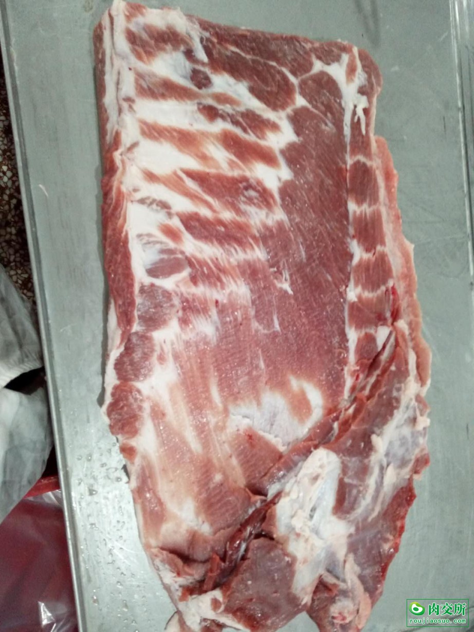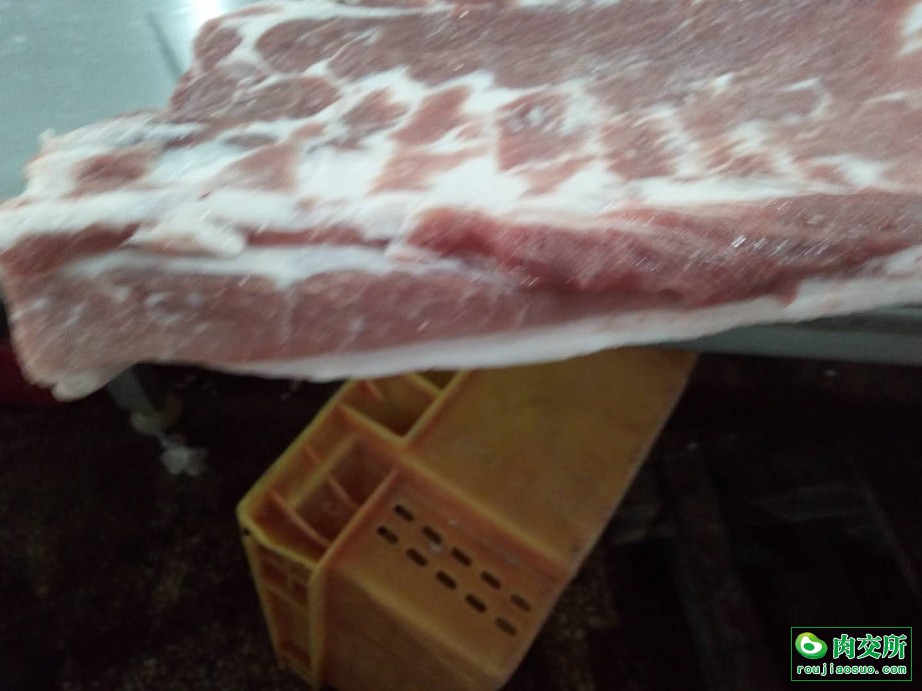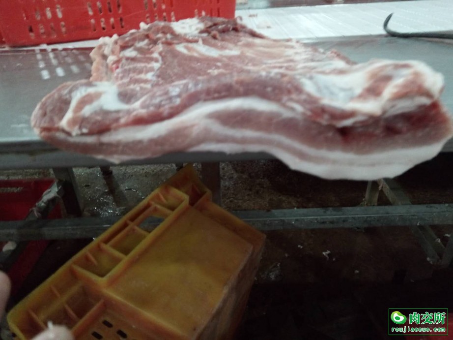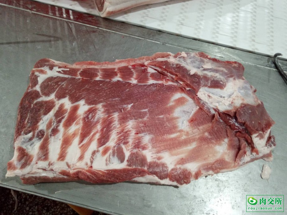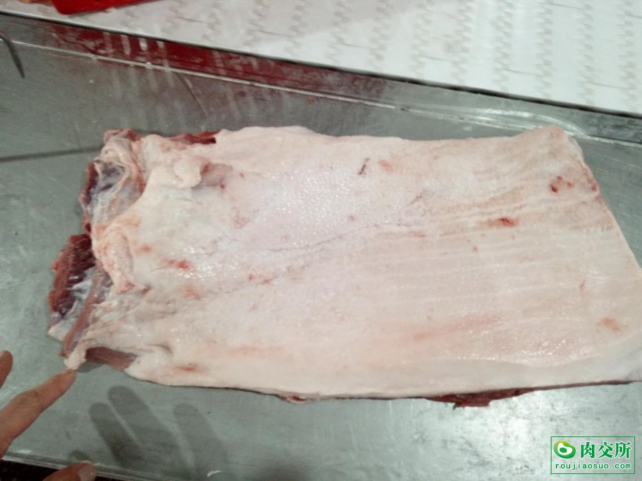 国产膘猪纯干一级去皮大五花,背面脂肪0.5一0.8Cm,箱装25公斤。