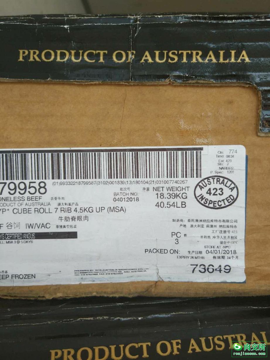 正关进口,澳洲 teys 423厂,安格斯 谷饲 YP级,生产日期2018-1-4