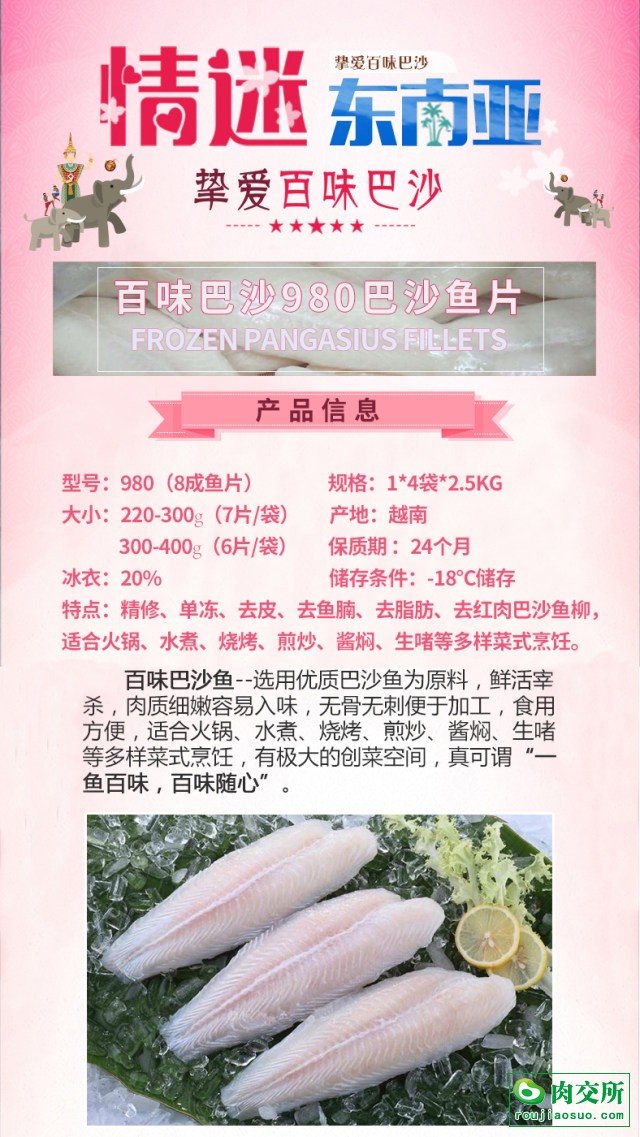 型号:980(8片成鱼) 规格:1*4袋*2.5kg 冰衣:20% 产地:越南