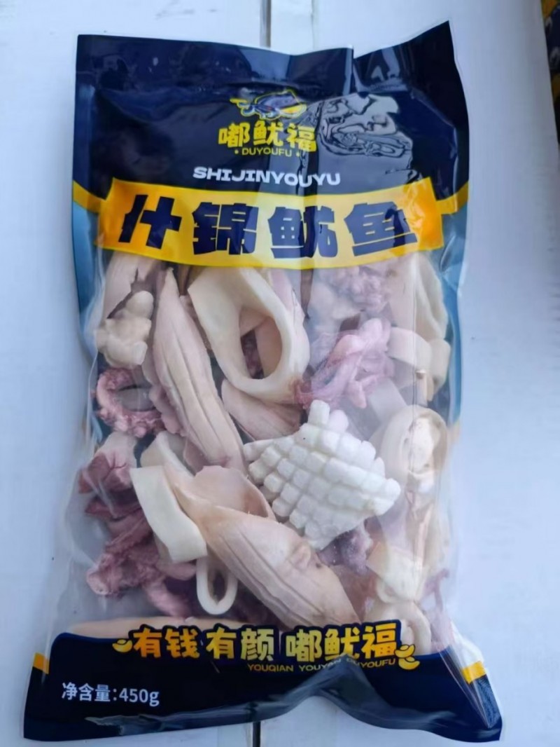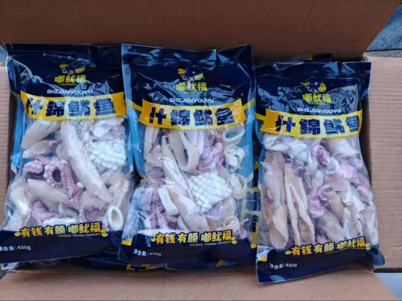 小包装450克什锦鱿鱼,一箱20包,一包450克,去箱净重9㎏,颜色正,口感好,货品质量分量有保障,始终如一!!!